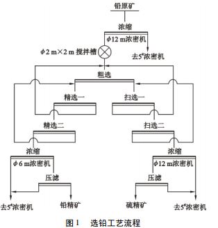 礦山選鉛工藝流程始建于1991年,提鉛原料主要為金氰化尾渣(鉛原礦),原設(shè)計(jì)處理鉛原礦能力80t/d。2003年為處理新建氰化廠氰渣,配套新建一套選鉛流程,設(shè)計(jì)處理能力80t/d。兩套浮選系統(tǒng)采用相同工藝,氰渣調(diào)漿后泵入選鉛濃縮機(jī)進(jìn)行濃縮,再進(jìn)入一次粗選、二次精選、二次掃選鉛浮選流程選出鉛精礦,經(jīng)濃縮機(jī)濃縮后壓濾成最終鉛精礦;浮選尾礦(硫精礦)進(jìn)入1濃縮機(jī)進(jìn)行濃縮,經(jīng)1臺XZA-240壓濾機(jī)壓濾后汽車運(yùn)至硫精礦堆場。